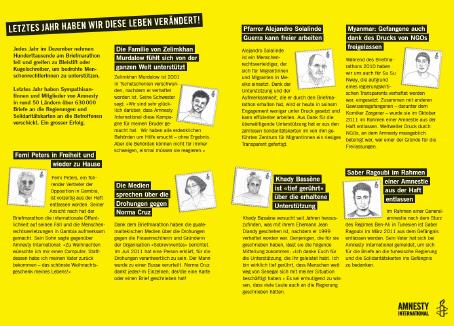 Jedes im Dez. startet Amnesty den Brief Marathon, um an konketen Einzelpersonen , die leiden, uns bewusst werden zu lassen, was Menschenrechte sind und wie und wo sie verletzt werden!