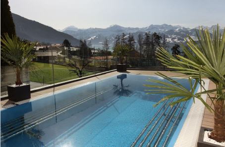 Ein Bad im Solewasser mit Ausblick auf den Thunersee und die Berge – fern von Stress und Hektik – ist der ideale Platz zur Gesunderhaltung des Körpers.